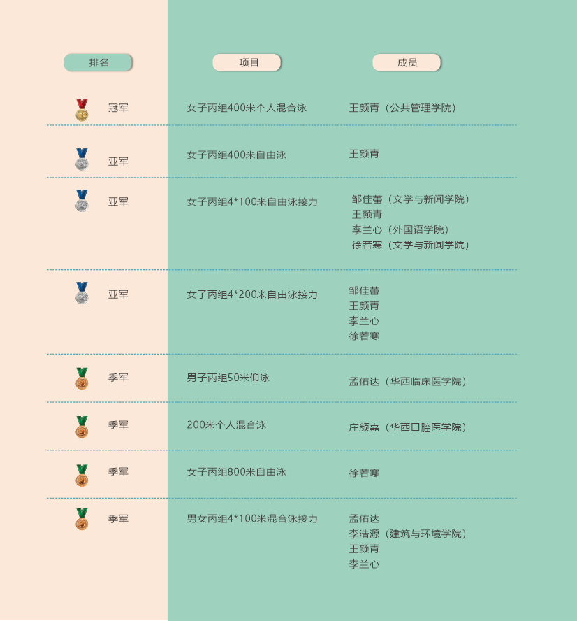 经过为期4天的比赛,四川大学游泳队获1金3银4铜,女子团体总分第三名,男女团体总分第四名的优异成绩。