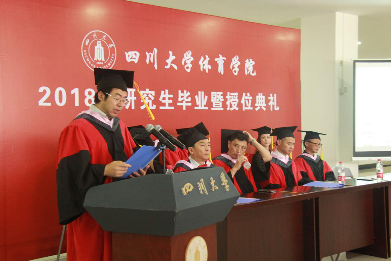 2018年6月26日上午,网投在线2018届硕士研究生毕业暨授位典礼在【官网】隆重举行。院党总支书记夏泽友同志、院长向勇教授、正处级组织员荣文学教授、副院长韩海军教授、副院长邱硕立副教授,硕士研究生导师唐成教授、吕志刚教授、张晓波教授、陈清副教授、李姗姗副教授在主席台就坐。教师代表、学生代表及2018届全体毕业生参加了典礼。典礼由体育科学研究所副所长李姗姗主持。