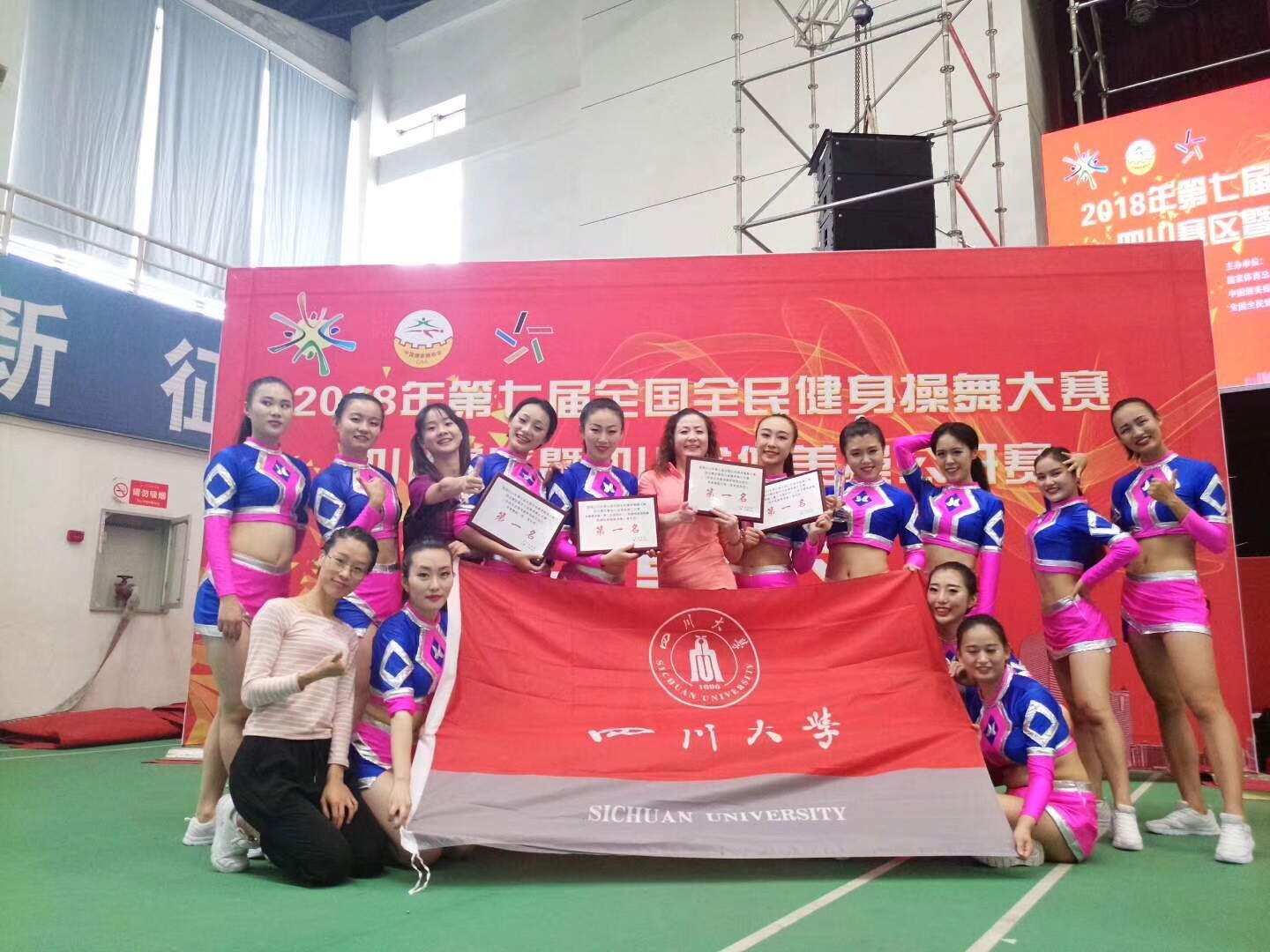 同日四川大学健美操代表队在张晓波教授的带领下,于2018年5月25日至27日参加了第七届全国全民健身操舞大赛四川省健美操公开赛。比赛中赛出了风格,赛出了水平,取得(规定动作)有氧舞蹈两项第一名、(自编动作)表演轻器械健身操和徒手有氧健身操两项第一名,她们以优秀的表现荣获四连冠,赢得了各位专家的高度认可,并夺得最佳编排奖。