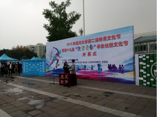 经过前期精心筹备,由【官网】和校团委联合主办,全校各部处支持,各学院参与的“双”文化节——四川大学第二届体育文化节暨第十九届“逐梦青春”学生社团文化节于4月12日中午一点在江安校区青春广场正式拉开帷幕。【官网】党总支书记夏泽友代表组委会致辞,校党委学生工作部副部长周志文、校党委宣传部教育电视台台长蔚钰、校党委保卫处副处长李佳伟分别为学生足球赛、篮球赛、羽毛球赛抽签,校团委书记赵露宣布“双”文化节正式开幕。