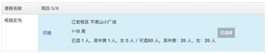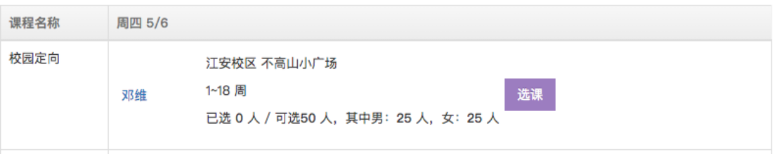 上课时间:周四,5、6节;课程名称:校园定向;上课教师:邓维;上课地点:江安校区 不高山小广场;已选人数:0人;可选人数:可选50人,其中男:25人,女:25人