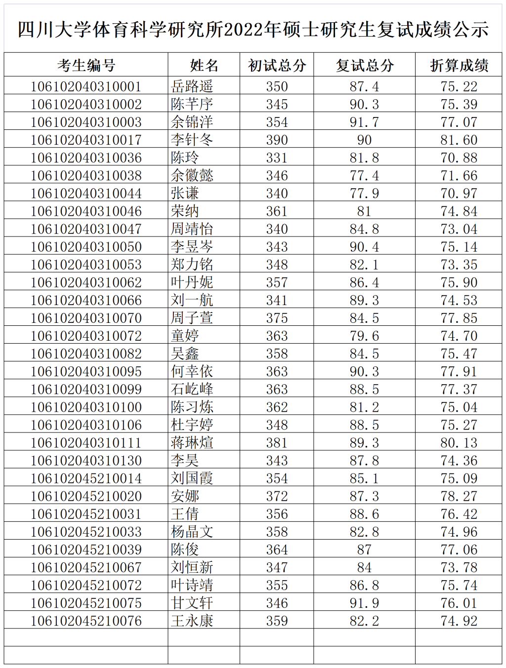 四川大学体育科学研究所2022年硕士研究生复试成绩公示