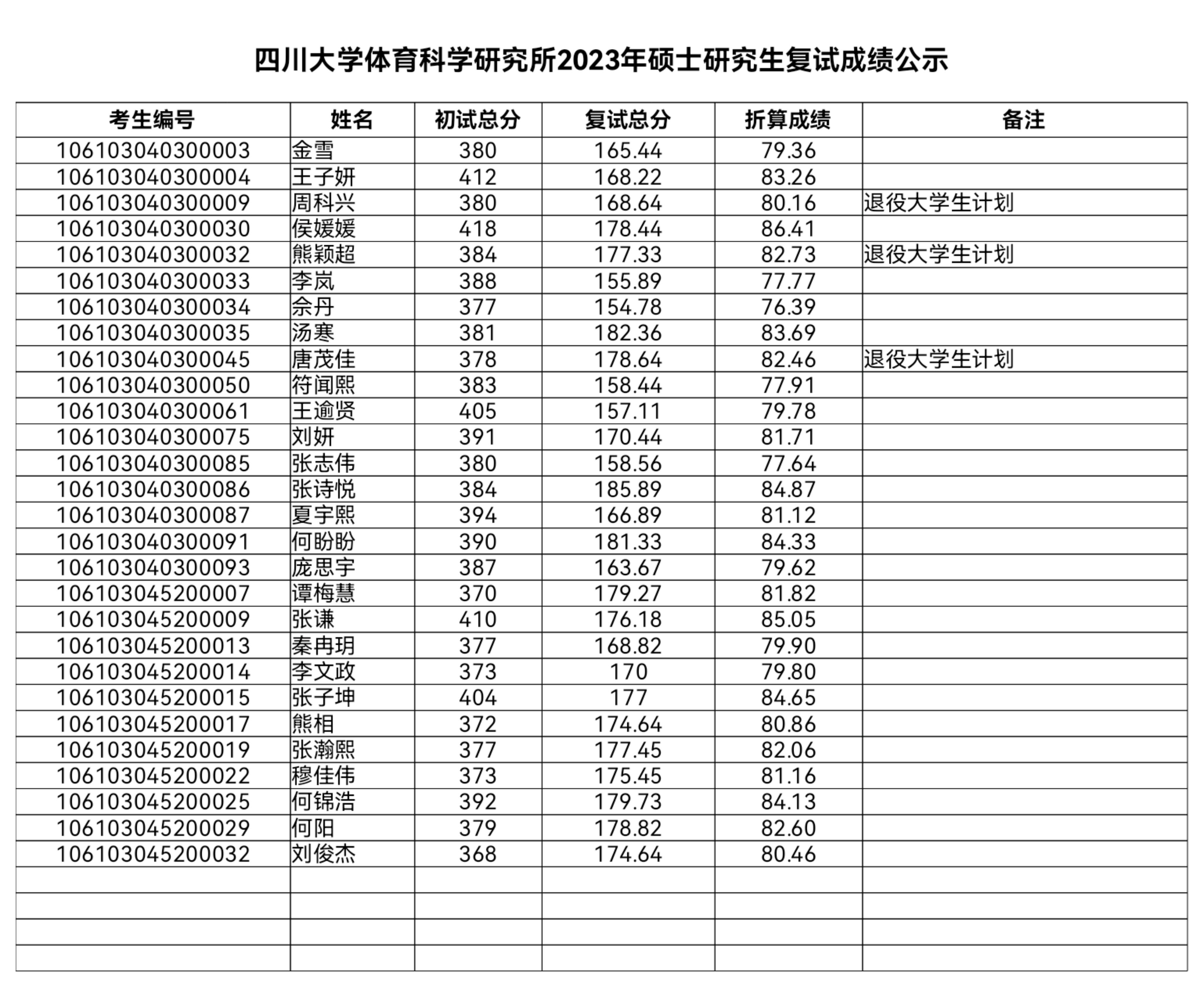 四川大学体育科学研究所2023年硕士研究生复试成绩公示