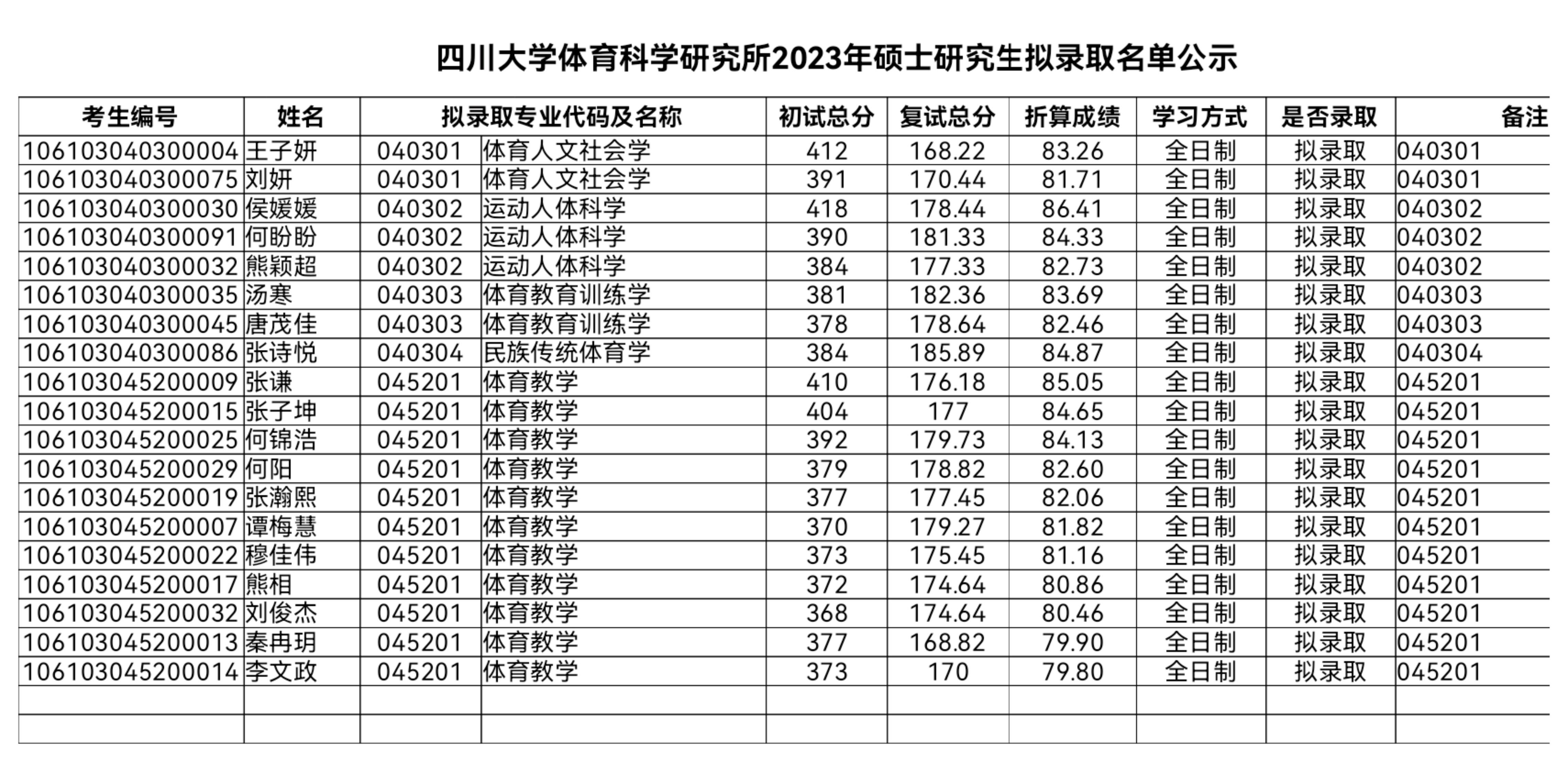 四川大学体育科学研究所2023年硕士研究生拟录取名单公示