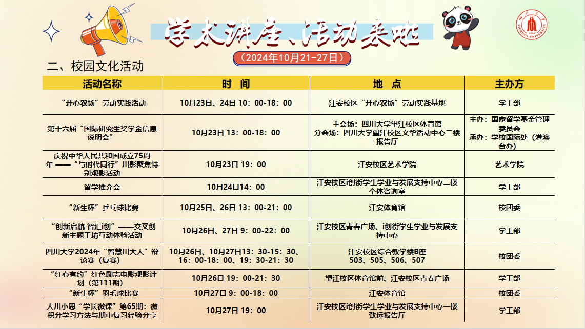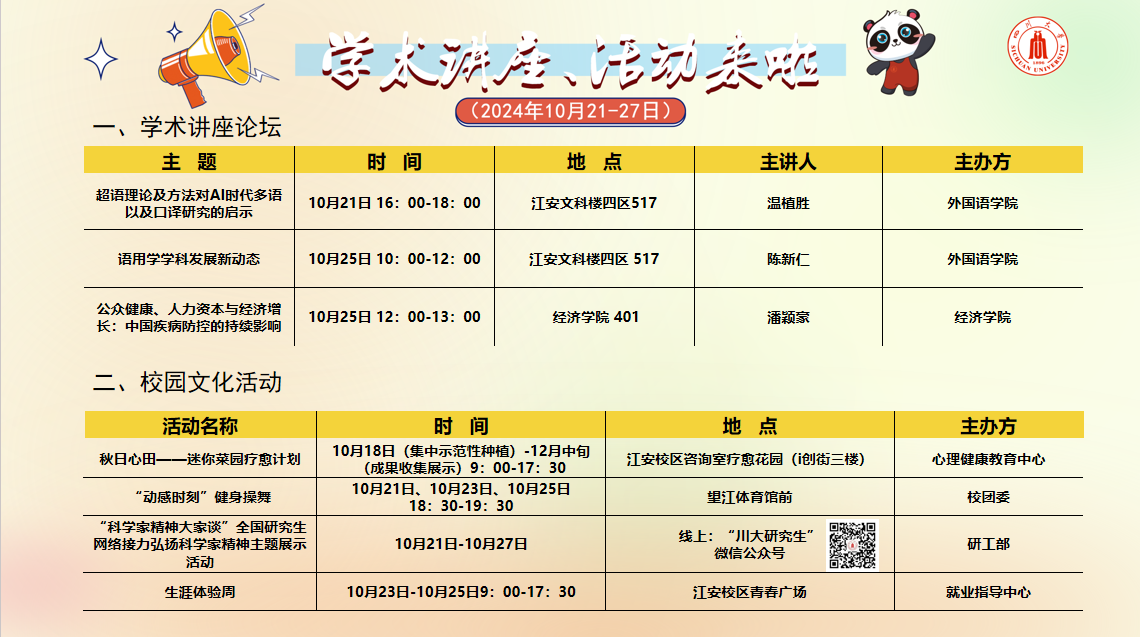 学术讲座及校园文化活动预告(10月21-10月27)