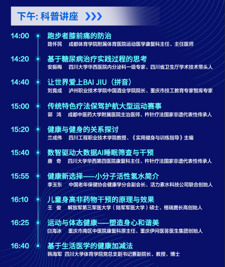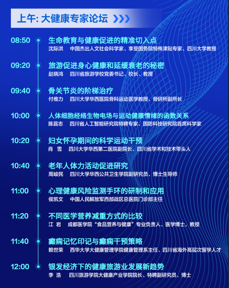 本次论坛的专家演讲分为两个部分,其中上午设置了“大健康专家论坛”,中国杰出人文社会科学家国务院特殊津贴专家沈继洪教授、四川省旅游学校党委书记兼校长赵晓鸿教授、四川大学华西医院骨科运动医学专家骨研所副所长付维力教授、四川省人工智能研究院特聘专家陈昌志研究员、四川大学华西第二医院副院长肖雪教授、四川大学华西公共卫生学院博士生导师周峻民副研究员、中国人民解放军西部战区总医院门诊部侯凯文主任、成都医学院食品营养与健康专业负责人江岩教授、四川省海外高层次留学人才西华大学大健康管理学院健康管理系赖世荣主任及四川旅游学院大健康产业学院院长李浩研究员等专家学者在本次论坛上作了主题演讲,介绍了教育、旅游、医疗、心理、运动、营养与大健康领域的重要科研成果和新进展。下午设置了“健康科普讲座”单元,邀请成都【官网】附属医院运动医学康复科主任路怀民、四川大学华西医院内分泌科一级专家安振梅、泸州职业技术学院中国酒业学院院长刘竟成、成都中医药大学附属医院杵针疗法国家非遗传人郭鸿、四川工程职业技术大学教授兰成伟、四川大学华西第四医院康复科主任唐奇、中国老年保健协会健康学分会副会长李玉东、中国医生集团联盟轮值主席王俊、重庆市南岸区中医院康复科原主任白海冰、四川大学公众健康与社会发展研究所所长韩海军等专业人士从疼痛、糖尿病、睡眠障碍、体态异常、发育异常等常见慢病的科学防治及传统特色疗法、运动健身、小分子活性氢水、生活方式医学促进健康等进行了系统健康科普。
