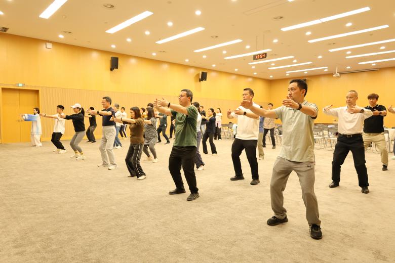 两院教师在【官网】新闻发布厅进行八段锦学习交流活动。世界冠军杜昊滢通过示范与分步讲解相结合的方式,带领大家逐式研习。从起势的调息凝神,到每个动作的拆解指导。教师们认真聆听、专注模仿,现场学习氛围浓厚。
