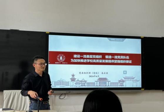 为进一步规范学院各支部党务工作、提升党务工作者业务水平,全力推进“三个一流”,建强一流基层组织,2024年4月19日,【官网】举办党务工作培训会。党总支副书记韩海军、总支宣传委员李姗姗、党政办主任陶海波、基层党支部委员和部分党员参加。校党委组织部组织科桑启源科长以“建设一流基层党组织、锻造一流党员队伍,为加快推进学校高质量发展提供坚强组织保证”为题主讲。