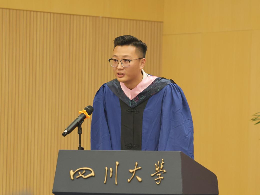 在校生代表甘文轩同学代表全体在校生向2024届的师兄师姐们表达最衷心的祝贺,祝贺师兄师姐们在祖国大地上抒写了属于“川大人”的绚烂华章,为自己的川大求学岁月画上圆满句号,他希望师兄师姐们能带着川大人深深的烙印去开拓探索,“赓续传承“川大红”,争做“有德”“有志”“有为”青年,把“海纳百川,有容乃大”的校训精神融入拼搏向上的动力中,为推进中国式现代化贡献青春智慧和力量!